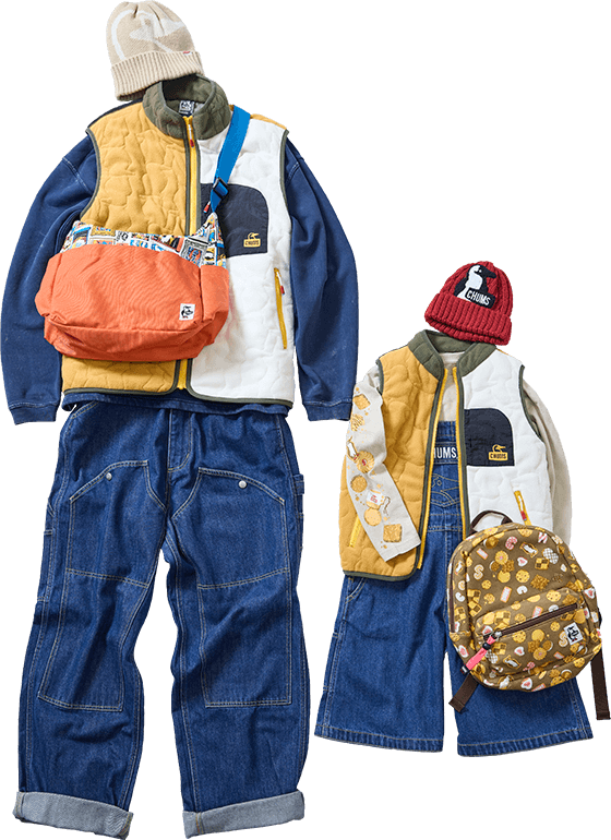 彩色的起絨背心和牛仔褲相結合,是戶外風格十足的親子搭配。兒童的長T恤和包包以餅幹為主題,充滿嘻哈風格!小物件也加入了極具存在感的設計,讓心情UP♪