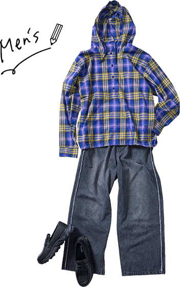 搭配多彩的女性風格,男士也可以選擇圖案的單品。格紋連帽襯衫搭配寬松牛仔褲打造街頭風格。運動鞋風鞋底便鞋增添個性。
