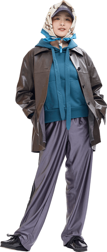 這款運動褲在獨特的連帽外套上增添了光澤感和高雅感。披上皮革風格的連衣褲,打造出成熟的休閒混搭風格。將圍巾圍在帽子上,嘗試高級搭配。