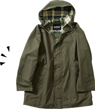 以運輸帶為基礎加上風帽,衣長也很長。寬松的尺寸感使得這款單品易於穿在裡面。隱約可見的格子襯裡是這款商品的亮點。