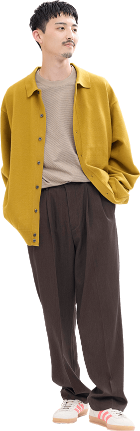 首推的是可以長時間穿著的“200天針織”的襯衫開衫。與上班休閒都能穿著的錐形輪廓的羊毛風褲子組合,打造出時尚的同色係搭配。