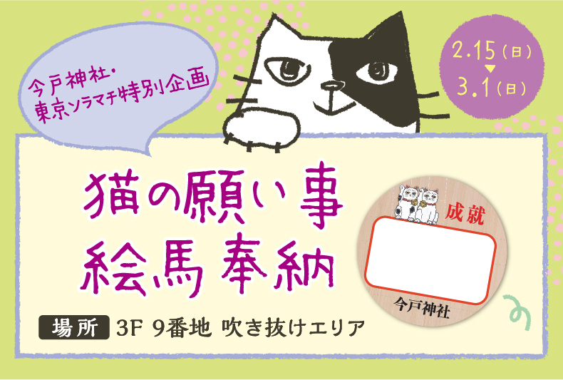 [貓咪祝福繪馬獻詞]距東京晴空塔城不遠的淺草伊馬堂神社被譽為「招手貓的誕生地」。請在繪馬貼紙上填寫與伊瑪堂神社所獲繪製繪馬相同的申請,我們把它放到面板上吧,♪這座繪馬將在稍後獻給伊馬多神社。我們期待您的參與。