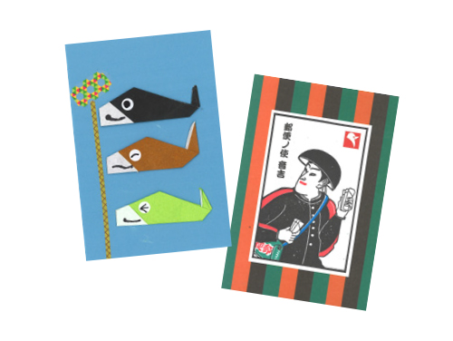 像多色印刷的木版畫一樣,用重疊按壓的印章完成繪畫!可以放在額頭上裝飾,因為是明信片大小,也可以作為信件寄出。而且,也制作在折紙鯉魚旗上用圖章和遮蔽膠帶裝飾的鯉魚旗卡。