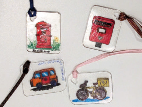 在塑料板上畫郵筒和郵政配送用的摩托車等與郵政相關的畫,制作姓名牌的小飾物。
