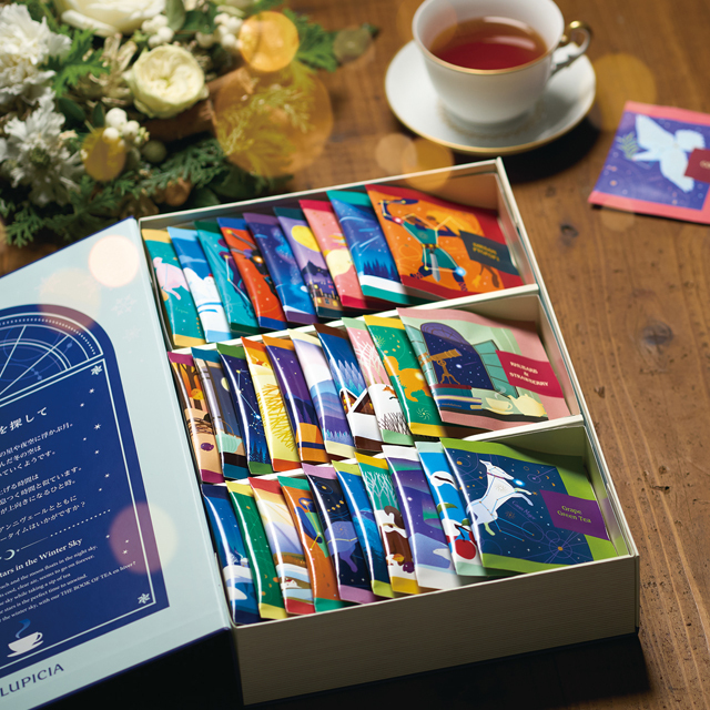 每一款茶包都以冬天的星座和天體、雪和風等自然的情景為主題,以仰望天空的片刻時光為印象,進行了豐富多彩的設計。