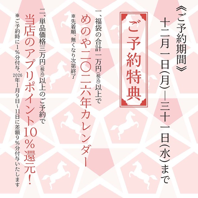 2026年開運福袋預約中!作為預約特典,福袋合計1萬日元以上贈送目野屋2025年日歷!(售完為止)