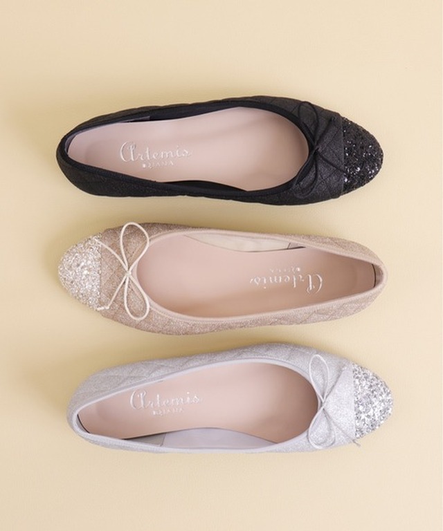 這款芭蕾舞鞋的亮線經過絎縫加工的原創面料和同色係的大顆粒亮片的組合非常華麗。
