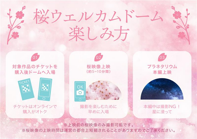 天象儀天空在天象儀正片放映前的等待時間,將放映被一望無際的櫻花包圍的“櫻花歡迎巨蛋”。