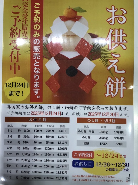 食品&甜點出售供品年糕、禮簽年糕、切年糕的通知!!senjushuku kitaya2025年12月17日 ~ 2025年12月30日 -
